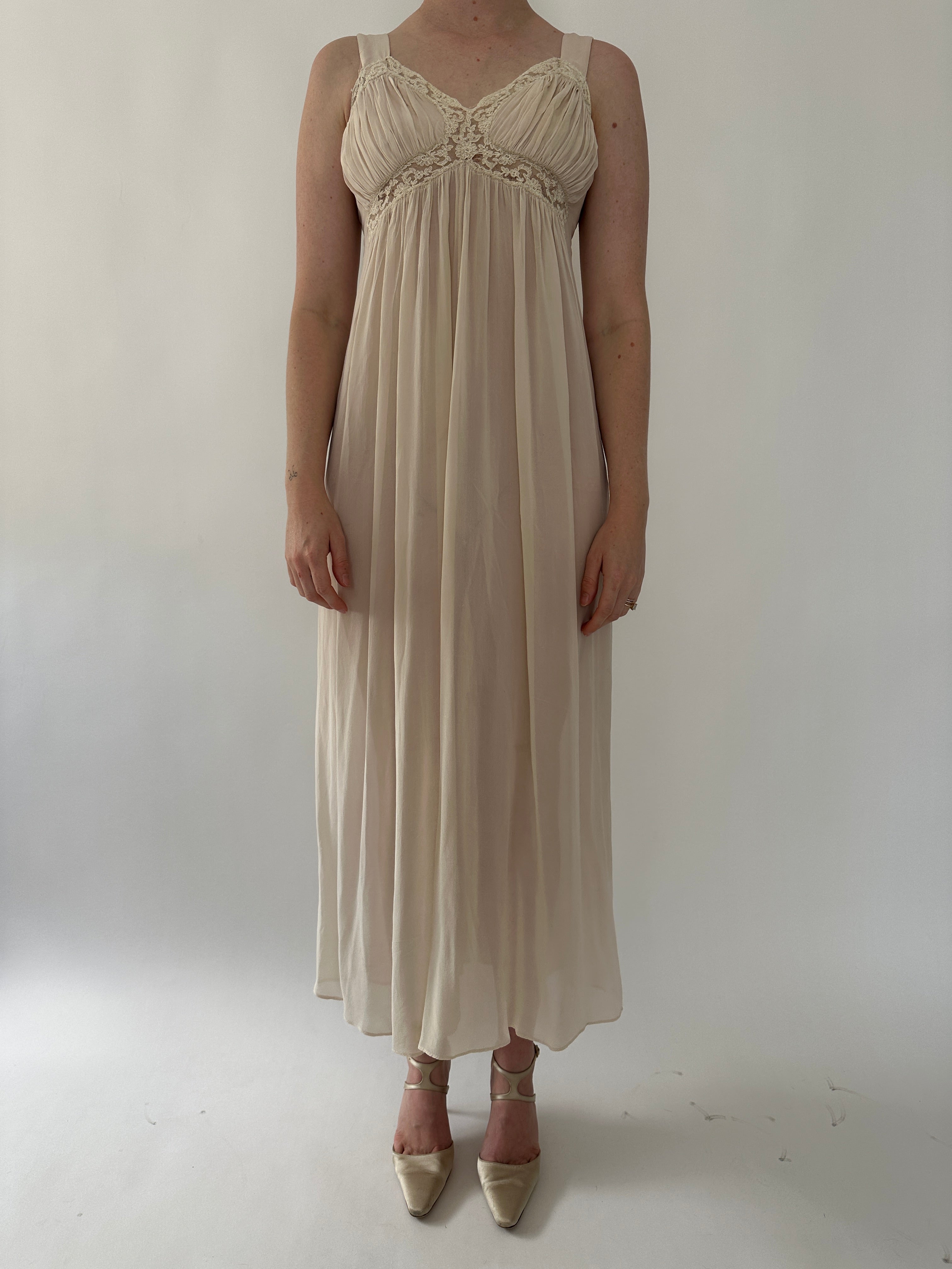 Super cute pale mauve 1930's silk chiffon slip dress. Same color lace on the bust and waist. Beautiful draping on bust and into the skirt. Such a flattering sweet dress.